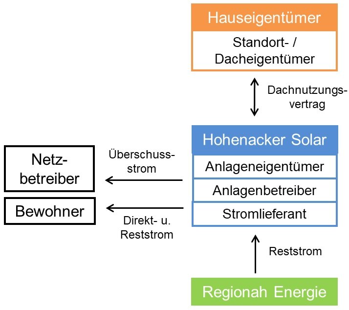 Hohenacker Solar ist der Anlageneigentümer, Betreiber und auch Stromlieferant und liefert den Direkt- und den Reststrom an die Mieter.